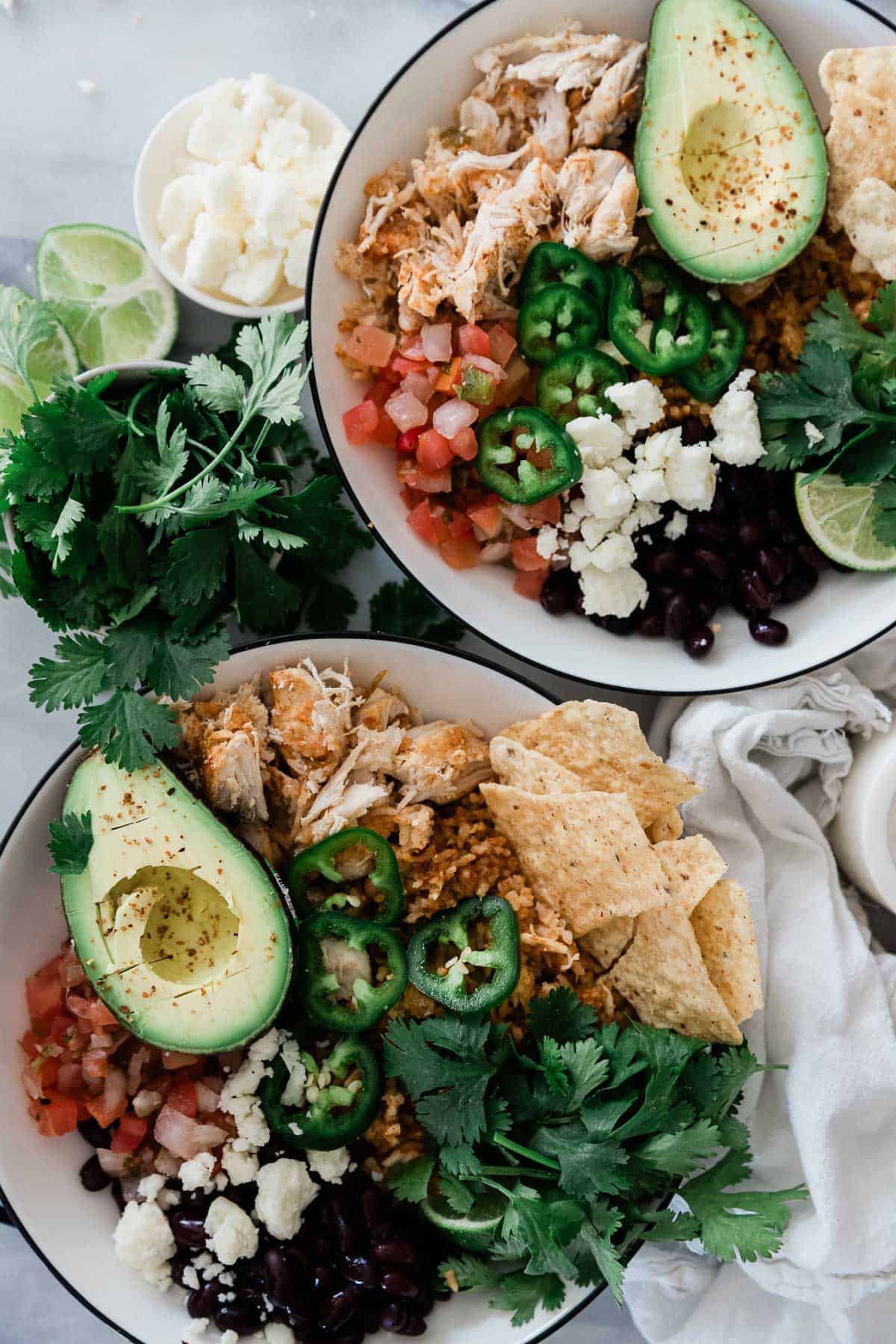 - Step 4: Assemble. Layer the rice and chicken into bowls and add your toppings of choice. One of my favorite toppings for these bowls is our easy homemade guacamole.